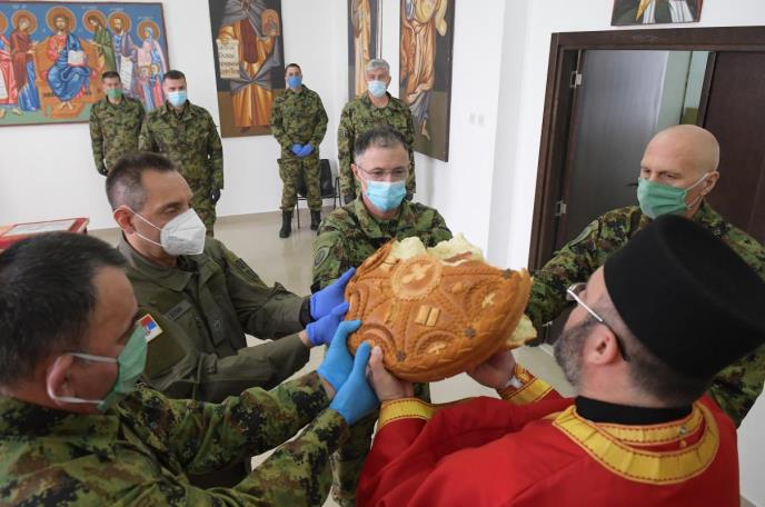 Liturgiju je služio vojni sveštenik Slađan Vlajić, nakon čega je, dodaje se, usledio obred osvećenja slavskih darova i rezanje slavskog kolača.