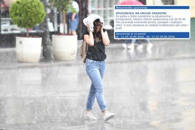 Lokalno se očekuju obilne padavine, od 20 do 40 mm za kratak vremenski period, ponegde i značajno više, navedeno je na sajtu RHMZ-a. U zoni pljuskova se očekuje i kratkotrajno jak vetar i grad. Meteorološko upozorenje traje do subote, 20. juna.
