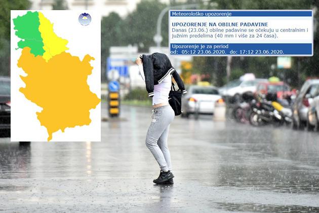 Republički hidrometeorološki zavod ponovio je upozorenje da će i danas iznad većeg dela Srbije lokalno biti velika količina padavina, 40 i više litara po kvadratnom metru za 24 časa.