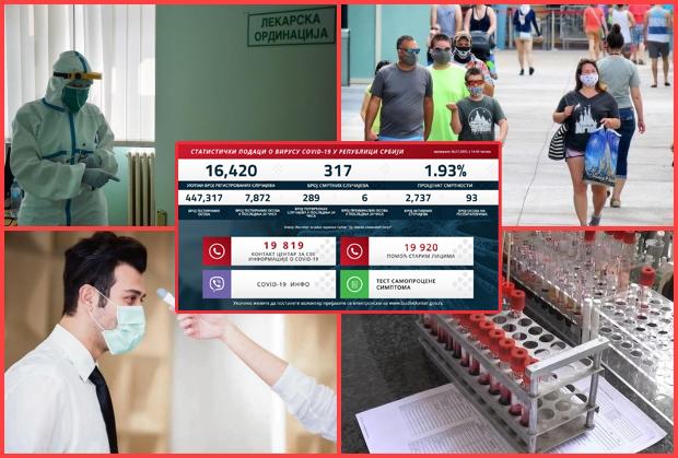 U Srbiji je od početka epidemije testirano 447.317 ljudi, od čega je pozitivno na virus korona bilo 16.420 osoba. Od posledica kovida 19 umrlo je 317 pacijenata.