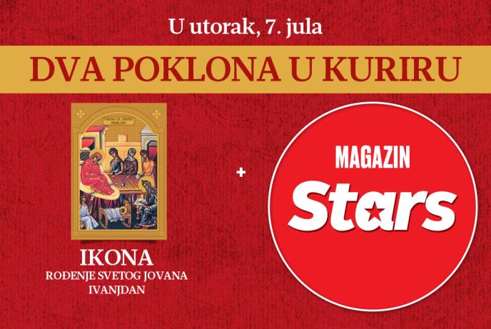 Srpska pravoslavna crkva i njeni vernici u utorak, 7. jula, obeležavaju Ivanjdan, rođenje svetog Jovana Preteče i krstitelja Isusa Hrista. Tim povodom, u Kuriru vas sutra čeka DVA POKLINA - IKONA ROĐENJE SVETOG JOVANA PRETEČE sa zlatotiskom i molitvom plus magazin STARS.