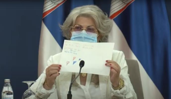 BEOGRAD - Dr Edita Stokić, direktorka KBC Vojvodina, danas je na kraju konferencije Kriznog štaba pokazala crtež jedne devojčice čiji je tata zaposlen u tom kliničkom centru.