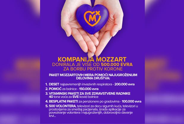Vitaminski paketi za medicinare bili su, inače, samo deo paketa pomoći od pola miliona evra koji je regionalni lider u priređivanju igara na sreću formirao za borbu protiv kovida. U okviru ovog paketa Mozzart je donirao sredstva za nabavku 10 najsavremenijih invazivnih respiratora, obezbedio 150.000 evra direktne finansijske pomoći za bolnice, više od 200 zaposlenih u Mozzartu dostavili su 6.000 paketa sa namirnicama najugroženijim građanima, a sektor logistike uz vozila i vozače, stavljen je na raspolaganje mnogim lokalnim samoupravama. IT sektor Mozzarta je za tri dana danonoćnog rada kreirao veb servis koji povezuje volontere i one kojima je pomoć potrebna i poklonio ga državi, a zaposleni kompanije su u nekoliko navrata dobrovoljno davali krv.