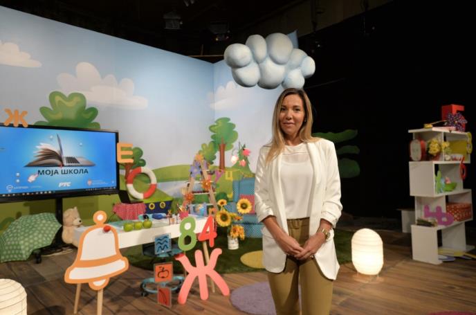 Studio u kom se snima nastava opremljen je pametnom tablom, a tu su i drugi rekviziti koji treba da dočaraju ambijent u učionici - ispisana ćirilična i latinična slova, pribor za likovno, instrumenti za muzičko, globus, slika Vuka Karadžića...