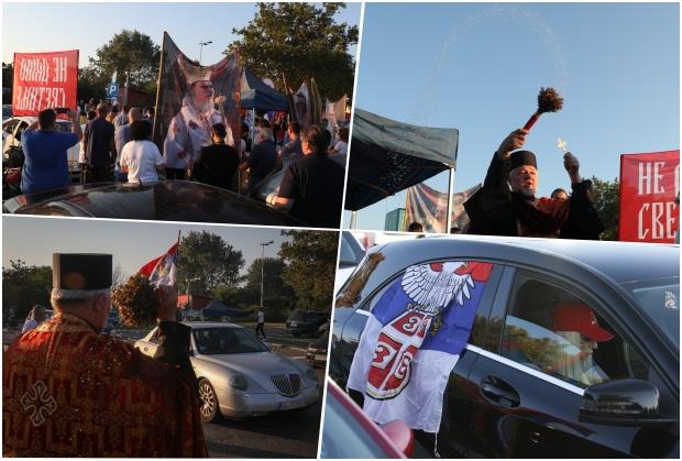 Učesnici auto - litije, opremljeni majcama na kojima piše Ne damo svetinje, Crna Gora - Srbija, jedna familija, zastavama Srbije i ikonama, okupili su se ispred Sava Centra, gde je služen i moleban.