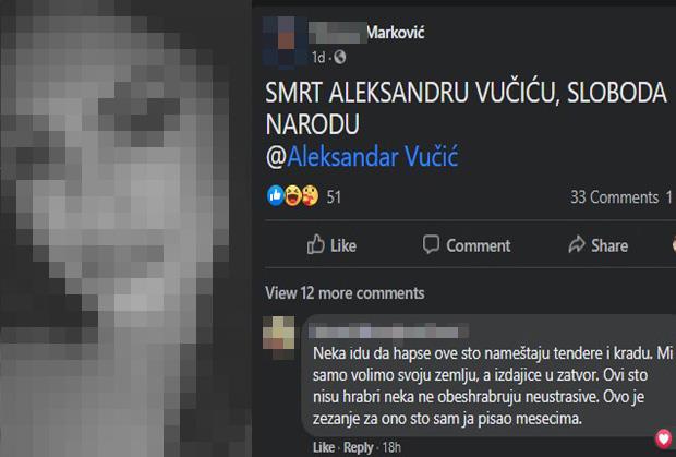 Ona je tako u jednoj poruci nedvosmisleno napisala "Smrt Aleksandru Vučiću, sloboda narodu", na šta je jedan od korisnika fejsbuka pod imenom Dragan Jović napisao "Amin", a bilo je i komentara poput: "Tako je, samo smrt Vučiću".