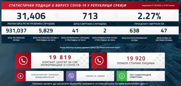 Od početka epidemije u Srbiji je zaraženo ukupno 31.406 osoba, a preminulo je 713.