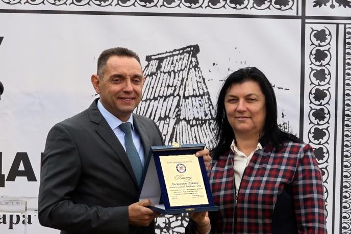 BEOGRAD - Ministru odbrane Aleksandru Vulinu danas je uručena Plaketa za izuzetan doprinos radu Saveza krajiških udruženja, kao i doslednu borbu za opstanak Srba u Republici Srpskoj i zemljama regiona, u okviru manifestacija "Krajišnici u riječi i slici" i "Petru za Petrovdan", održanih u Etno parku "Brvnara" u Bačkom Jarku, pod pokroviteljstvom Saveza krajiških udruženja - Novi Sad, Centra za očuvanje kulture i tradicije krajiških Srba i Kulturnog centra "Lukijan Mušicki" - Temerin.