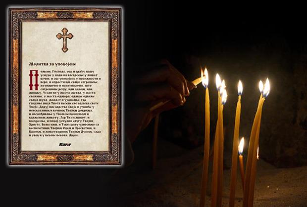 "Pomeni, Gospode, oce i braću našu usnule u nadi na vaskrsenje u život večni, i sve upokojene u pobožnosti i veri, i oprosti im svako sagrešenje, hotimično i nehotimično, što sagrešiše rečju, ili delom, ili mišlju. I useli ih u mesta svetla, u mesta svežine, u mesta odmora, odakle odbeže svaka muka, žalost i uzdisanje, gde gledanje lica Tvoga veseli sve od veka svete Tvoje. Daruj im carstvo Tvoje i učešće u neiskazanim i večnim Tvojim dobrima, i naslađivanje u Tvom beskonačnom i blaženom životu. Jer si Ti život, i vaskrsenje i pokoj usnulih slugu Tvojih, Hriste, Bože naš, i Tebi slavu uznosimo sa bespočetnim Tvojim Ocem i Presvetim, i Blagim, i životvornim Tvojim Duhom, sada i uvek i uvekove vekova. Amin."