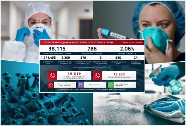 U poslednja 24 sata hospitalizovano je 88 osoba, a 46 ih je otpušteno sa bolničkog lečenja. Do danas je u Srbiji registrovano ukupno 38.115 potvrđenih slučajeva kovid 19, a preminulo je ukupno 786 osoba. Testirano je ukupno 1.271.455 osoba koje su ispunjavale kriterijume definicije slučaja.