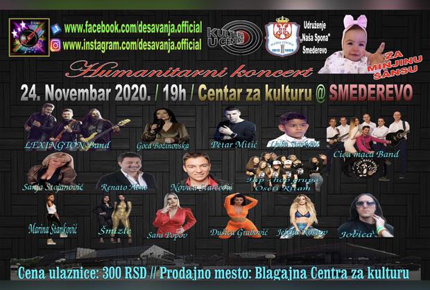 Humanitarni koncert za Minju Matić, koja boluje od teške neuromišićne bolesti - Spinalna mišićna atrofija, tip 1., održaće se 24. Novembra 2020. (utorak) u Centru za kulturu u Smederevu, sa početkom u 19 časova. Na koncertu će nastupati: Lexington Band, Goca Božinovska, Petar Mitić, Ljuba Stanković, Cica Maca Band, Sanja Stojanović, Renato Henc, Novica Starčević, Hip hop ,,Oseti ritam“, Marina Stanković, Šmizle, Sara Popov, Dušica Grabović, Jelena Kostov i Jovica...