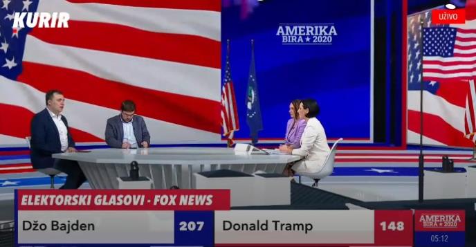 Ljubiša Ivanović u ulozi izveštača s lica mesta prenosiće nam atmosferu iz Njujorka, dok će u beogradskom studiju Kurir televizije sa eminentnim gostima razgovarati Ivana Majstorović i Silvija Slamnig. Biće i grafičkih analiza u najsavremenijem virtuelnom studiju. Tokom cele večeri ugledni sagovornici će komentarisati tok izbora.