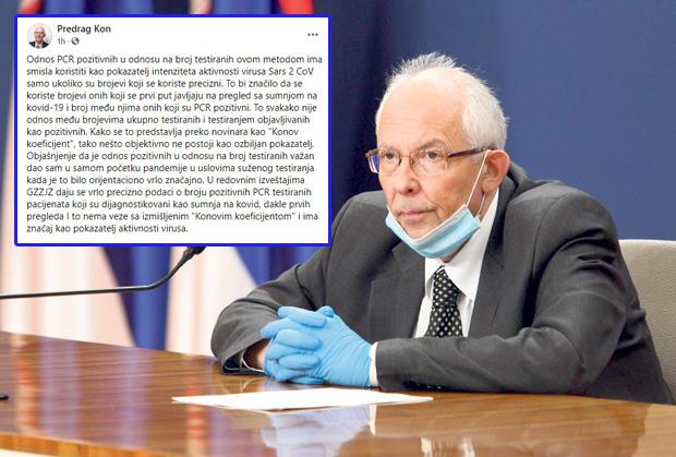 - Odnos PCR pozitivnih u odnosu na broj testiranih ovom metodom ima smisla koristiti kao pokazatelj intenziteta aktivnosti virusa Sars 2 CoV samo ukoliko su brojevi koji se koriste precizni. To bi značilo da se koriste brojevi onih koji se prvi put javljaju na pregled sa sumnjom na kovid-19 i broj među njima onih koji su PCR pozitivni. To svakako nije odnos među brojevima ukupno testiranih i testiranjem objavljivanih kao pozitivnih. Kako se to predstavlja preko novinara kao "Konov koeficijent", tako nešto objektivno ne postoji kao ozbiljan pokazatelj. Objašnjenje da je odnos pozitivnih u odnosu na broj testiranih važan dao sam u samom početku pandemije u uslovima suženog testiranja kada je to bilo orijentaciono vrlo značajno. U redovnim izveštajima GZZJZ daju se vrlo precizno podaci o broju pozitivnih PCR testiranih pacijenata koji su dijagnostikovani kao sumnja na kovid, dakle prvih pregleda I to nema veze sa izmišljenim "Konovim koeficijentom" i ima značaj kao pokazatelj aktivnosti virusa - napisao je epidemiolog Kon.