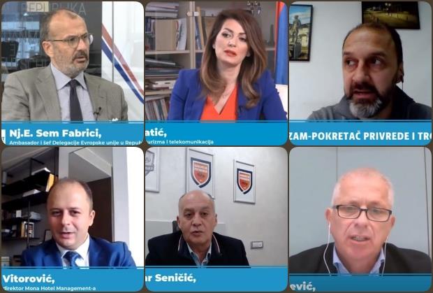 Na početku današnje onlajn konferencije najpre su ministarka trgovine, turizma i telekomunikacija Tatjana Matić i šef Delegacije EU u Srbiji Sem Fabrici odgovarali na sledeća pitanja: Ima li potencijala za oporavak turizma već od zimske sezone ili od marta 2021. godine? Koji su koraci za oporavak jedne od najperspektivnijih grana u podizanju vrednosti našeg tržišta?