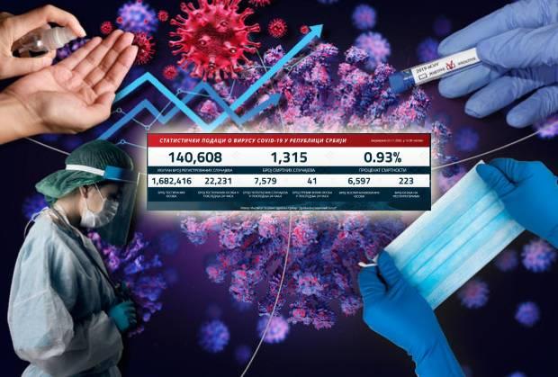 Hospitalizovano je 6.597 osoba, od kojih su 223 pacijenta na respriatoru, dva manje nego juče. Od početka epidemije u Srbiji je zaraženo 140.608 osoba, a 1.315 je preminulo. Do sada je testirano 1.682.416 uzoraka. Procenat smrtnosti je 0,93 odsto.