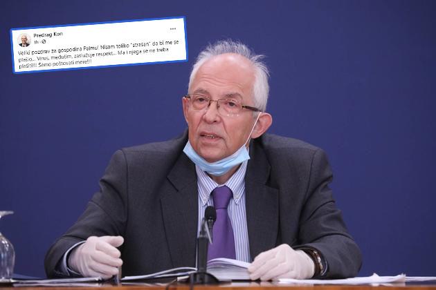 "Veliki pozdrav za gospodina Palmu! Nisam toliko "strašan" da bi me se plašio... Virus, međutim, zaslužuje respekt... Ma i njega se ne treba plašiti. Samo poštovati mere!", napisao je dr Kon na svom Fejsbuk profilu.