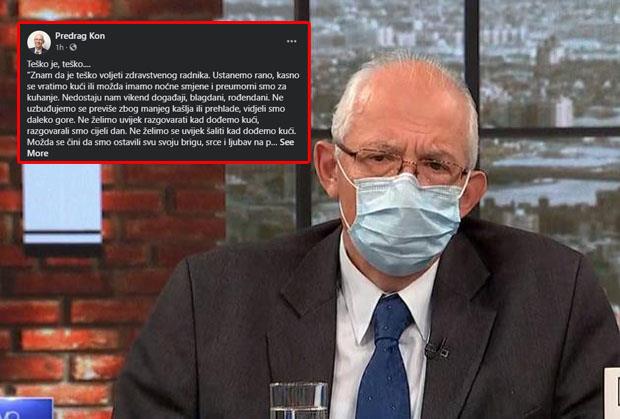 Član Kriznog štaba Predrag Kon podelio je danas emotivan status na društvenim mrežama o životu zdravstvenih radnika i naglasio da je "teško" voleti osobu koja se bavi tim poslom.