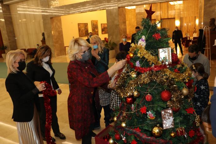 Ministarka za rad, zapošljavanje, boračka i socijalna pitanja, Darija Kisić Tepavčević, sa korisnicima Ustanove za decu i mlade Sremčica, u Palati Srbija okitila je novogodišnju jelku i poželela deci i svima zdraviju Novu godinu.