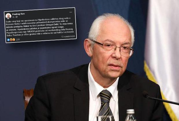 Epidemiolog i član Kriznog štaba za borbu protiv korona virusa Predrag Kon izjavio je da svako onaj koji ga upozorava na Hipokratovu zakletvu zbog rada u Kriznom štabu i nekih navodno prihvaćenih kompromisa treba da se duboko preispita, makar to bio i profesor Dragan Delić.