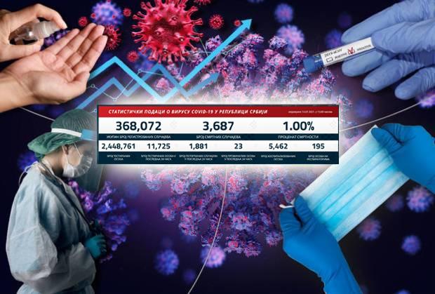 Nažalost, u poslednja 24 sata preminule su još 23 osobe. Na respiratorima u bolnicama širom Srbije je 195 pacijenata. Hospitalizovano je 5.462 obolelih, a na respiratorima se nalazi 195 pacijenata. Ukupno je do sada u Srbiji zaraženo 368.072 osoba, preminulo je 3.687, a testirano 2.448.761 građana.