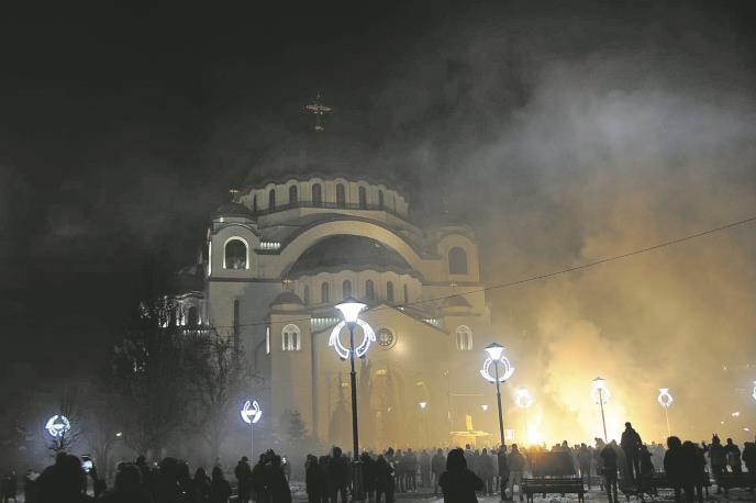 Prema odluci kriznog štaba zbog epidemije koronavirusa, nije dozvoljeno organizovanje proslava, ali se pred Hramom Svetog Save spontano okupilo stotinak ljudi koji su palili sveće, bacali petarde i zapalili baklje.