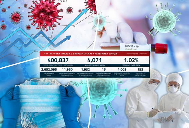 Od početka pandemije od kovida-19 je obolelo 400.837 građana, a preminuo je 4.071. Do danas u 15 časova u Srbiji je na korona virus testirano ukupno 2.652.095 osoba.