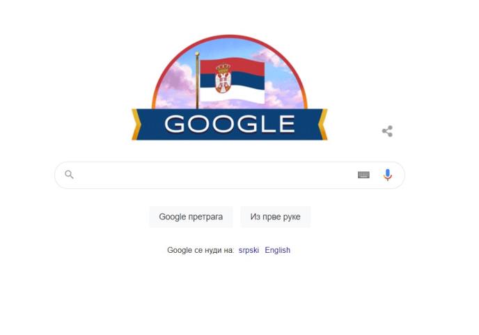LOS ANĐELES - Kompanija Gugl je na svojoj uvodnoj stranici posle ponoći umesto svog logoa postavila zastavu Srbije za korisnike u Srbiji, a povod je Dan državnosti koji se danas obeležava u našoj zemlji.