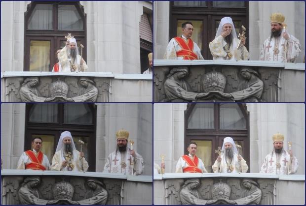 Na balkonu se pojavio zajedno sa vladikama SPC, odakle je blagosiljao okupljene ispred Patrijaršije.