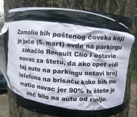 BEOGRAD - Zamolio bih poštenog čoveka koji je juče ovde na parkingu zakačio reno klio i ostavio novac za štetu da ako opet vidi taj auto na parkingu ostavi broj telefona na brisaču, glasi deo poruke zakačene na drvo čiji početak liči na bezbroj poruka koje ste dosad videli nas Fejsbuku.