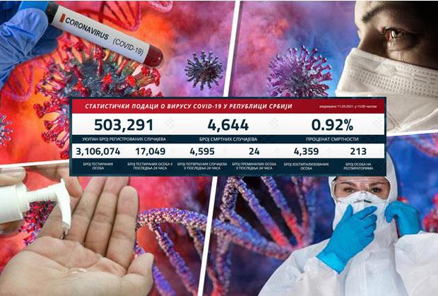 Nažalost, preminuo je 24 pacijent. Na respiratorima u bolnicama širom Srbije trenutno se nalazi 213 pacijenata.
