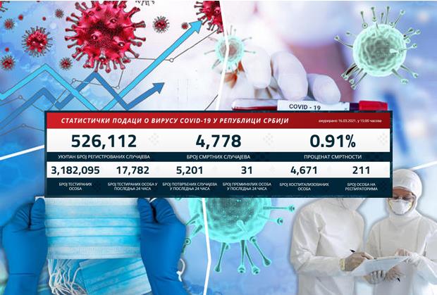 Preminuo je 31 pacijent, a na respiratorima u bolnicama širom Srbije trenutno je njih 211.