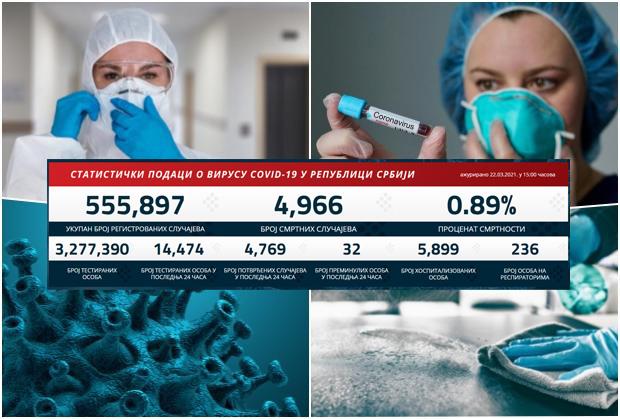 Preminula su 32 pacijenta, a na respiratorima u bolnicama širom Srbije trenutno se nalaze 236 obolela.