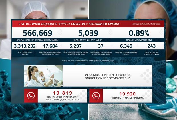 Na bolničkom lečenju nalazi se 6.349 osoba. Od početka pandemije u Srbiji je registrovano 566.669 slučajeva korona virusa, a preminulo je 5.039 ljudi. Procenat smrtnosti je 0,89.