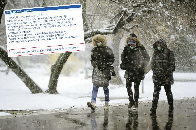 Inače, žuti meteo alarm zbog niskih temperatura i snežnih padavina danas je na snazi na teritoriji cele Srbije.