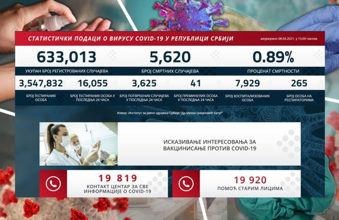 Preminuo je 41 pacijent, a na respiratorima u bolnicama širom Srbije trenutno se nalazi 265 obolelih.
