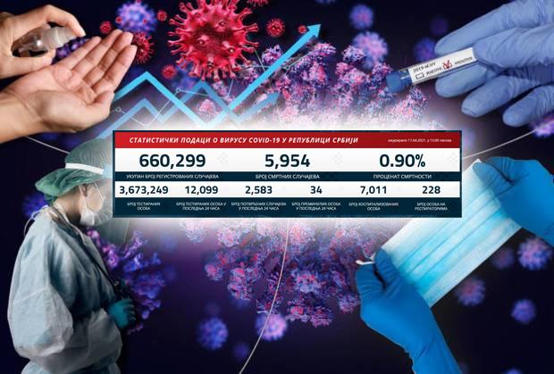 Preminulo je 34 pacijenata, a na respiratorima u bolnicama širom Srbije trenutno se nalazi 228 obolelih.