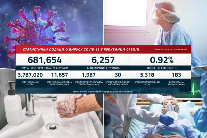 Preminulo je 30 pacijenata, a na respiratorima u bolnicama širom Srbije trenutno se nalazi 183 obolelih.