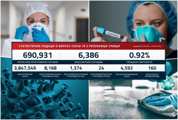 KORONA PODACI SVE BOLJI: Novozaraženih 1.374, preminula 24 pacijenta, pad broja obolelih na respiratorima