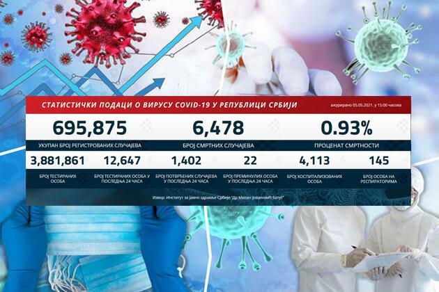 KORONA MIRUJE POSLE PRAZNIKA: Novozaraženih 1.402, preminula 22 pacijenta DOSAD UKUPNO DATO 3.661.515 DOZA VAKCINE