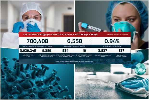 U Srbiji je u prethodna 24 sata na korona virus testirano 9.389 građana od kojih je 834 novozaraženo.