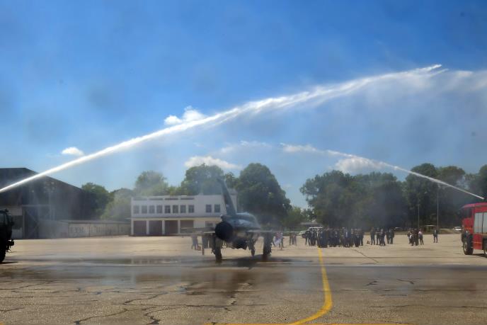 Legendarni avion MiG-21 sibolično je pozdravljen tradicionalnim vodenim slavolukom u čast dugogodišnje službe u našoj vojnoj avijaciji.