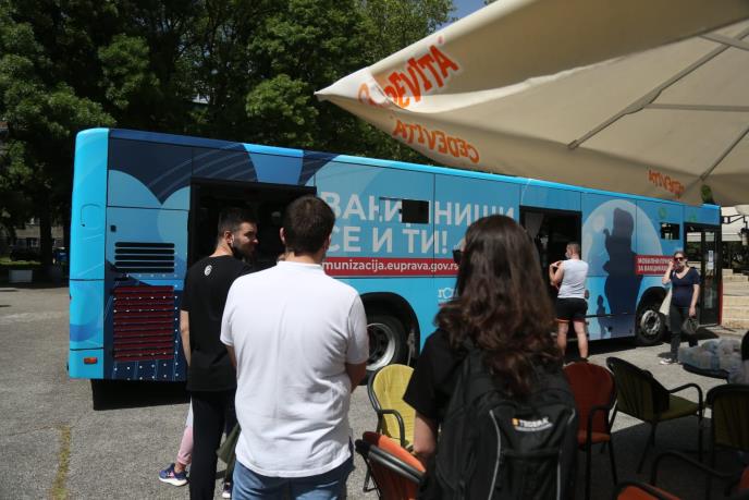 Studenti su juče pohrlili za vakcine protiv koronavirusa na mobilnom punktu za vakcinaciju u autobusu koji je bio postavljen u dvorištu Studentskog grada. Mogli su da biraju između dva cepiva - "Fajzerovog" i "Sinofarmovog".