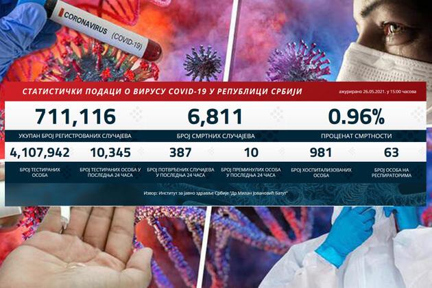 U Srbiji je u prethodna 24 sata na korona virus testirano 10.345 građana od kojih je 387 novozaraženo.