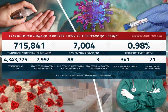 U Srbiji je u prethodna 24 sata na korona virus testirano 7.992 građana od kojih je 88 novozaraženih.