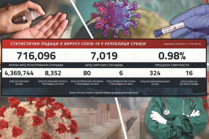 BEOGRAD - U Srbiji je u prethodna 24 sata na korona virus testirano 8.352 građana od kojih je novozaraženih 80.