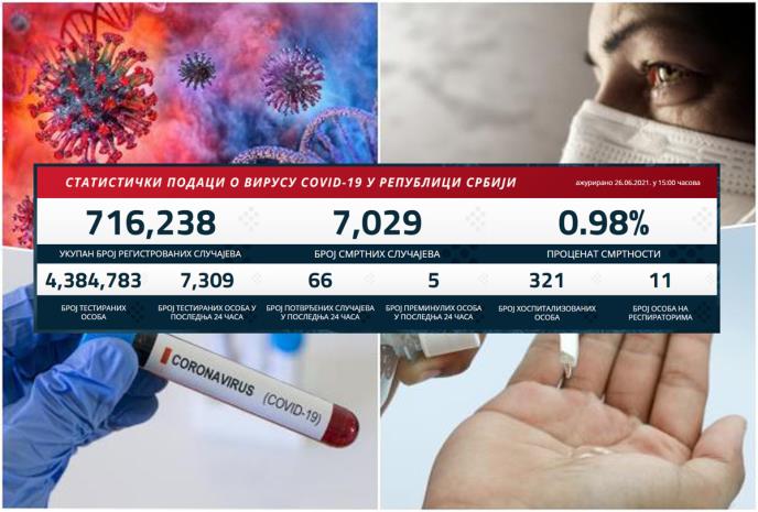U Srbiji je u prethodna 24 sata na korona virus testirano 7.309 građana od kojih je 66 novozaraženih.