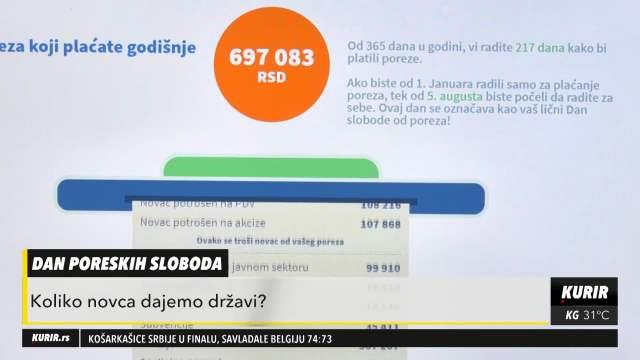 Prema računici portala "Moj porez", prosečnom platom od 65 000. Građani uplate u PIO fond preko 250 000 dinara godišnje, 110 000 u RFZO, oko 170 000 kroz PDV i akcize, a novac od poreza se troši na plate u javnom sektoru, javne nabavke, otplate kamate na javni dug, subvencije i penzije.
