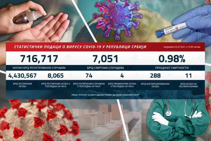 U prethodna 24 sata u Srbiji je na korona virus testirano 8.065 građana od kojih su 74 novozaražena.