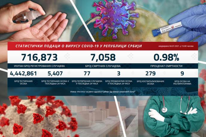 U prethodna 24 sata u Srbiji je na korona virus testirano 5.407 građana od kojih su 77 novozaraženih.