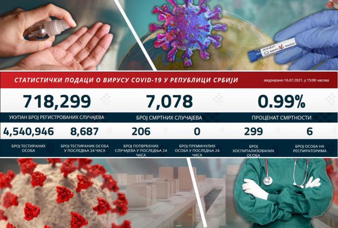 U prethodna 24 sata u Srbiji je na korona virus testirano 8.687 građana od kojih je 206 novozaraženo.